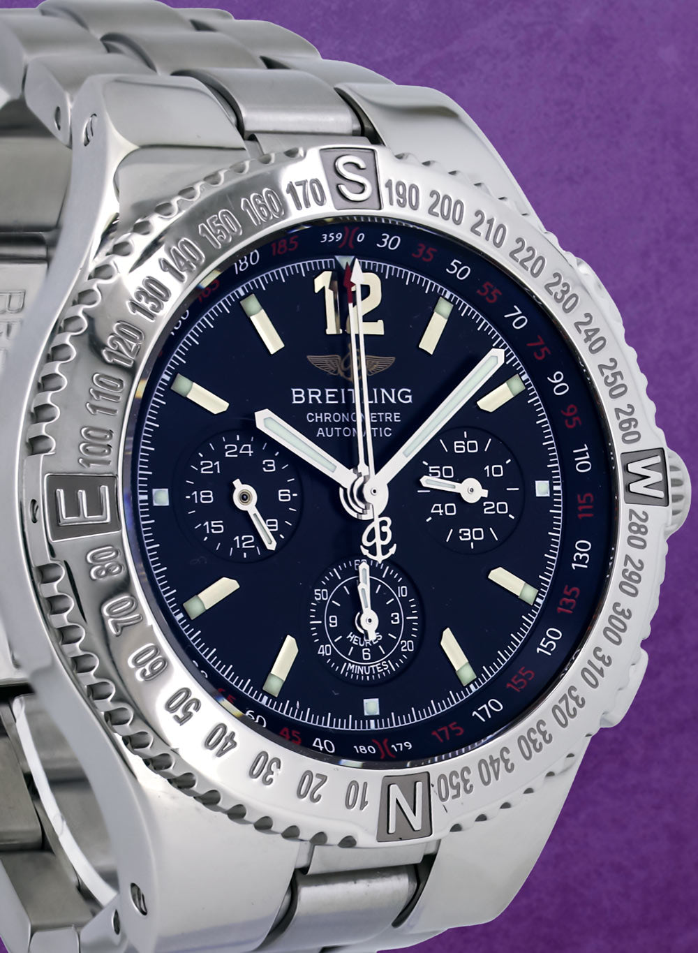 Royal Jewelers offers this certified preowned Breitling Hercules Chronograph reference A39362 in near-mint condition. This Breitling (Model: A39362) dates from circa 2005. The stainless steel case is 45mm in diameter and has a rotating bezel with compass points. Black dial with applied markers and luminous hands indicating hours, minutes, small seconds, 24-hour display, chronograph seconds with 60 minute and 12 hour counters, and a self-winding movement. The watch comes on a stainless steel bracelet with folding clasp. No box or papers.