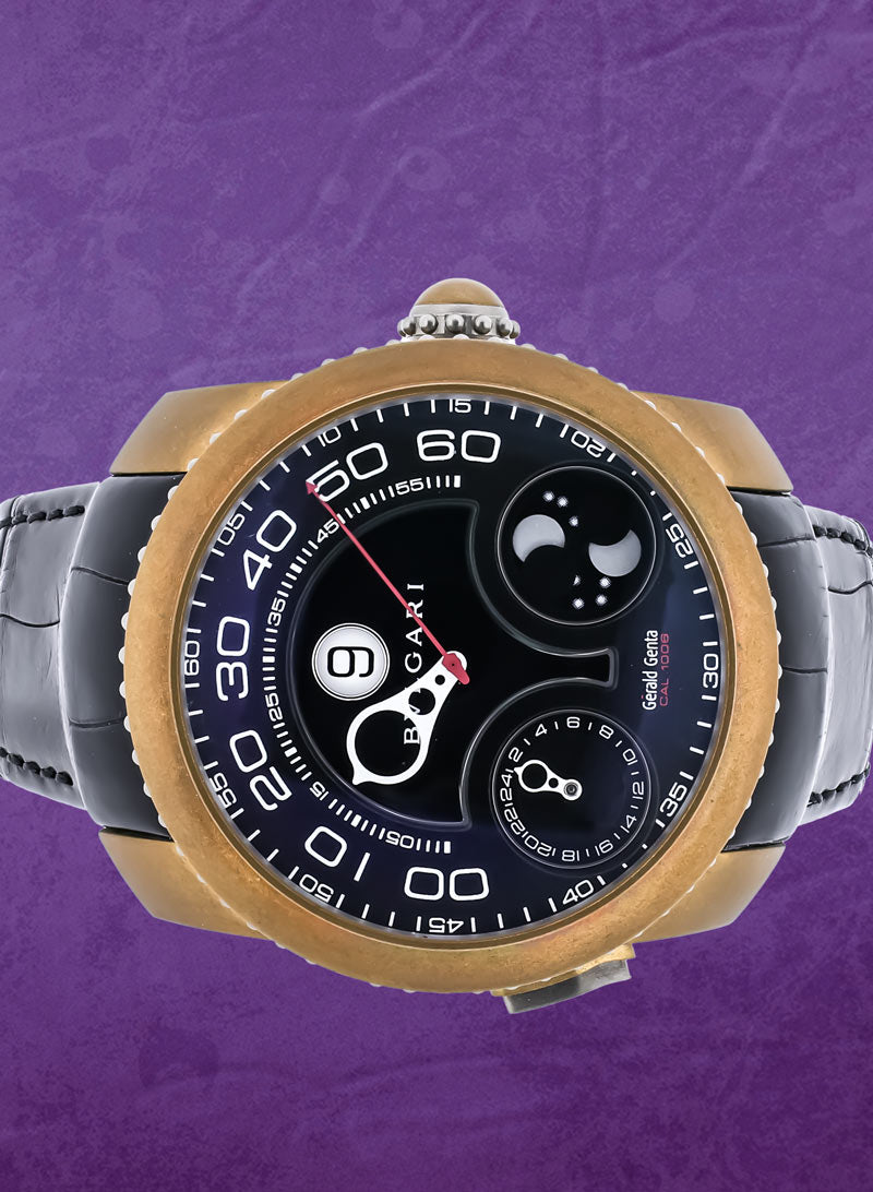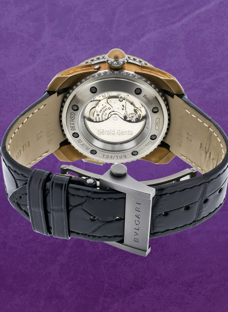 Royal Jewelers offers this certified preowned Bulgari Gerald Genta reference GSY.T.98 in mint condition. This is from a limited edition of 199 pieces. The bronze and titanium case is 46 mm in diameter. Black dial with digital hour display, retrograde minutes, sweep seconds, second time zone (set via the push button at 7 on the case), and moon phase display. The self-winding movement is visible through the sapphire case back. Black alligator strap with double folding titanium buckle. This Royal Jewelers certified preowned Bulgari (Model: GSY.T.98) comes complete with box and papers.