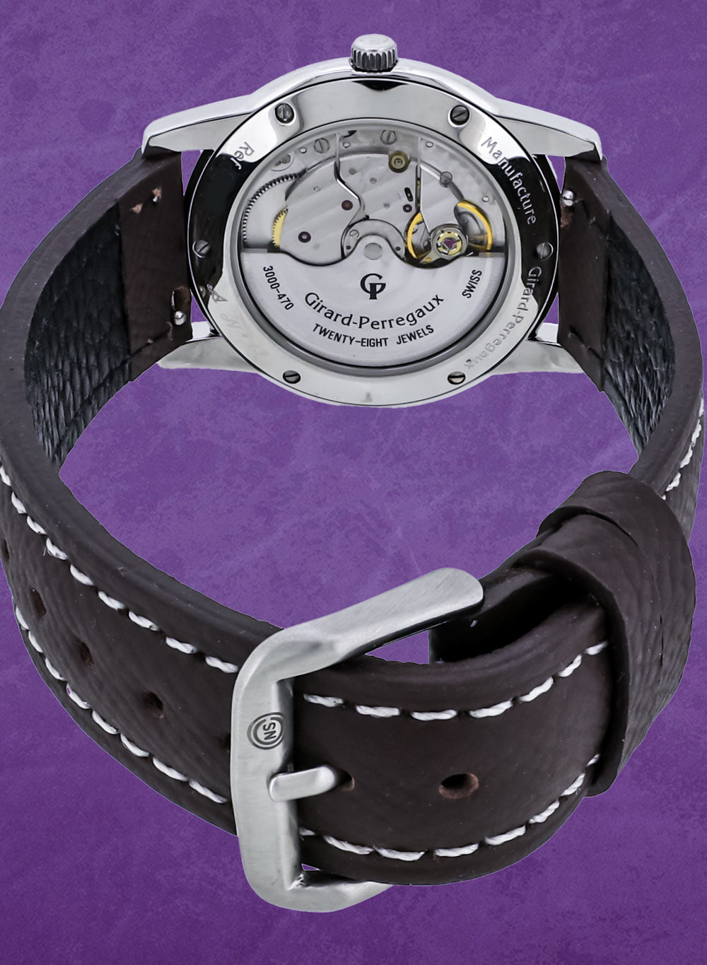 Royal Jewelers offers this certified preowned Girard-Perregaux Classic Elegance reference 9050 in near-mint condition. The stainless steel case is 34 mm in diameter. White dial with Roman hours and Dauphine hands indicating hours, minutes, and small seconds. The self-winding Girard-Perregaux caliber 3000 is visible through the sapphire case back. Brown calf strap with steel pin buckle. No box or papers.