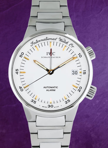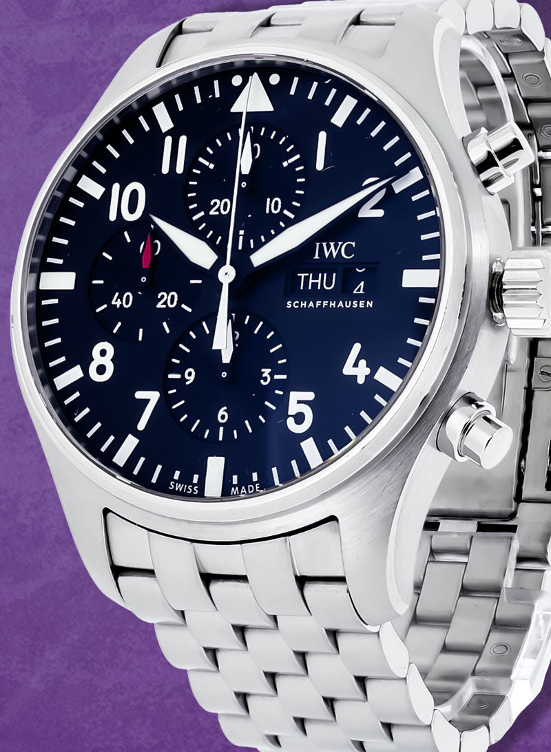 Royal Jewelers offers this certified preowned IWC Pilot Chronograph reference IW377704 in near-mint condition. This IWC (Model: IW377704) was originally purchase 2016. The stainless steel case is 43 mm in diameter. Black dial with Arabic hours and luminous hands indicating hours, minutes, small seconds, day and date windows, and chronograph with 30 minute and 12 hour counters. Self-winding movement. Stainless steel bracelet with adjustable folding clasp. No box or papers.