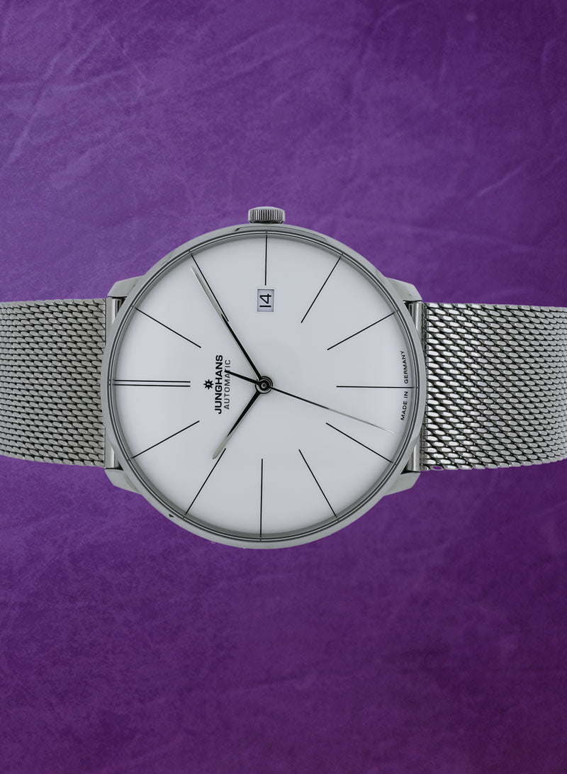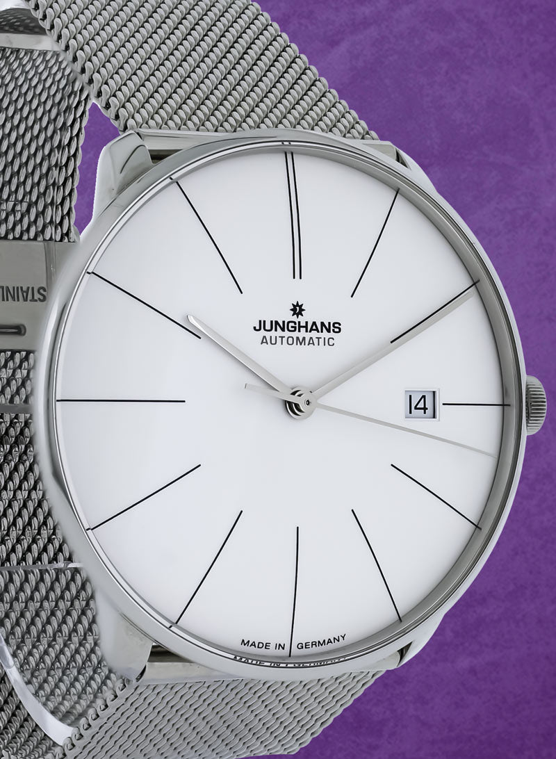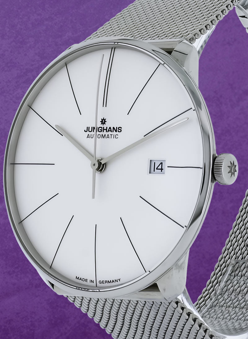 Royal Jewelers offers this certified preowned Junghans Meister Fein reference 27/4152.00 in mint condition. This Junghans (Model: 27/4152.00) was originally purchased in 2022. The stainless steel case is 39.5 mm in diameter. Silver dial with printed hours and baton hands indicating hours, minutes, sweep seconds, and date window. The self-winding movement is visible through the sapphire case back. Stainless steel mesh bracelet with clasp. This Royal Jewelers certified preowned Junghans (Model: 27/4152.00) comes complete with box and papers.