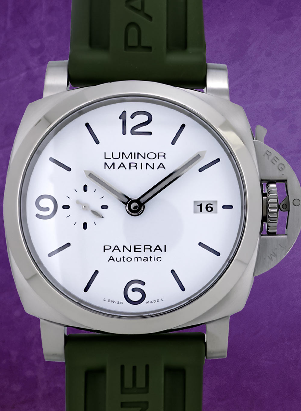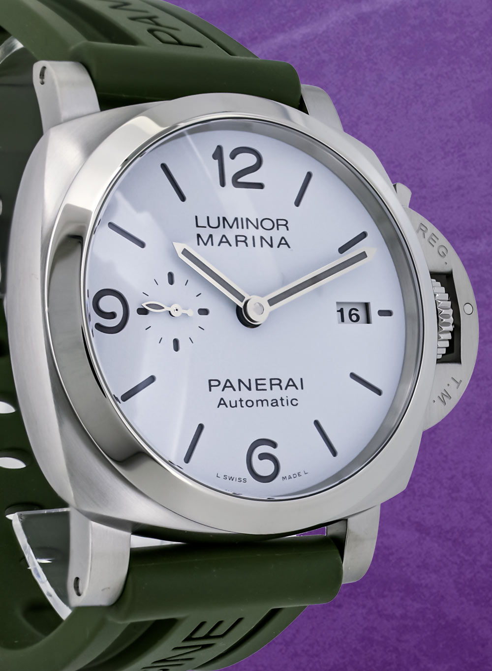 Royal Jewelers offers this certified preowned Panerai Luminor Marina PAM 1314 in near-mint condition. This Panerai (Model: PAM 1314) was originally purchased in 2021. The stainless steel case is 44 mm in diameter. White sandwich dial with luminous markers and hands indicating hours, minutes, small seconds, and date window. Self-winding movement. This Panerai (Model: PAM 1314) comes with both green rubber strap with pin buckle and additional gray calfskin strap. This Royal Jewelers certified preowned Panerai (Model: PAM 1314) comes complete with box and papers.