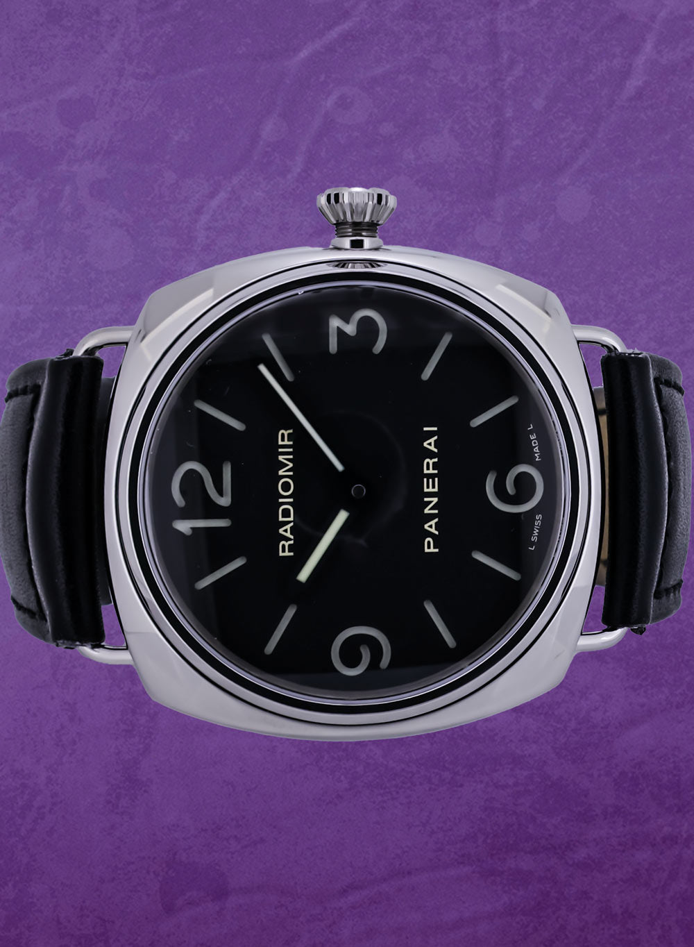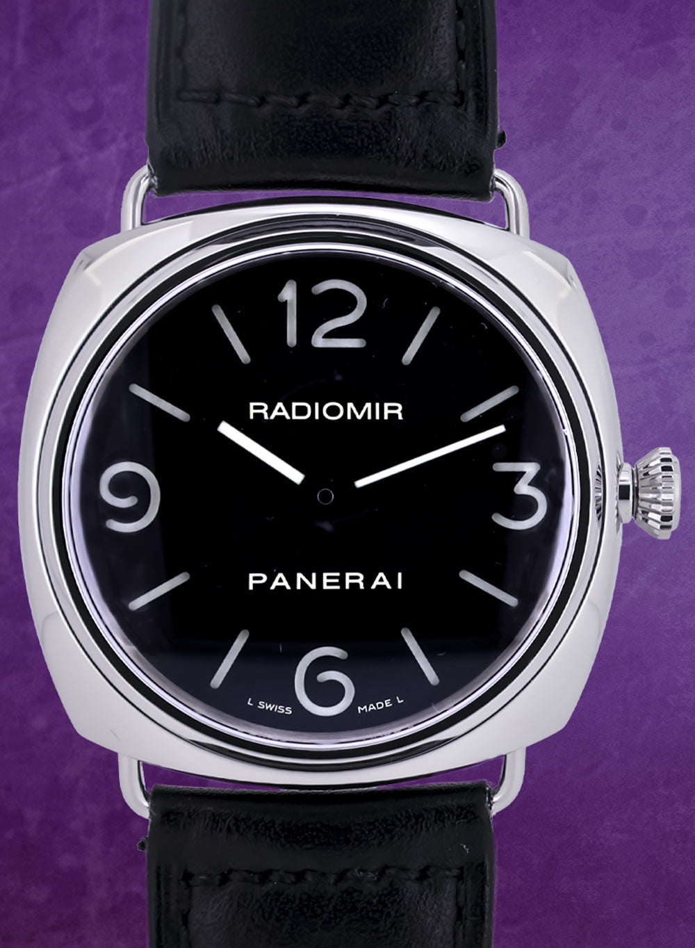 Royal Jewelers offer this certified preowned Panerai Radiomir PAM 210 in near-mint condition. This Panerai (Model: PAM 210) comes from the I-series year, 2006, and was serviced in 2026. The stainless steel cushion case is 45 mm in diameter. Black sandwich dial with luminous markers and hands indicating hours and minutes. The manual winding movement is visible through the sapphire case back. Black calf strap with steel pin buckle. This Royal Jewelers certified preowned Panerai (Model: PAM 210) comes complete with box and papers.