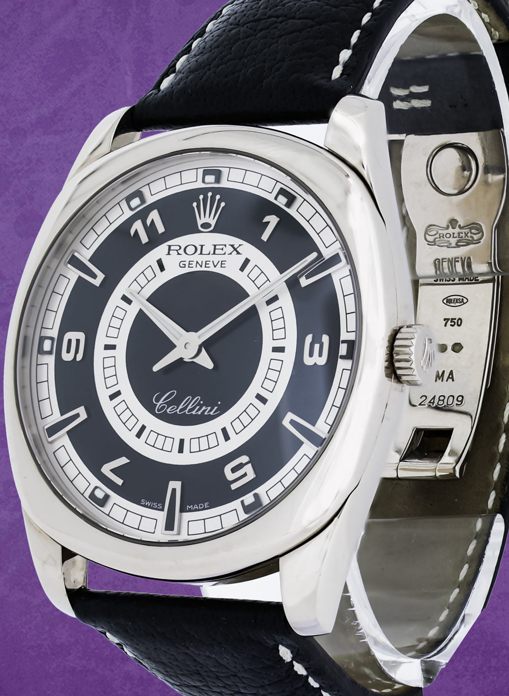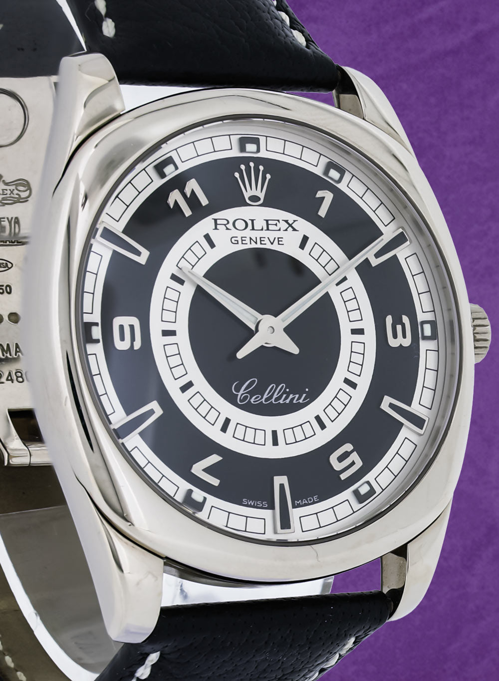 Royal Jewelers offers this preowned Rolex Cellini Danaos reference 4243/9 in excellent condition. This Rolex (Model: 4243/9) was made in 2009. The 18K white gold case is 39 mm in diameter. The dial features a bullseye pattern of alternating rings of black and silver, with applied Arabic and index markers and white gold hands indicating hours and minutes. Black calfskin Rolex strap with 18K white gold Rolex folding buckle. This Royal Jewelers preowned Rolex comes with Rolex box.