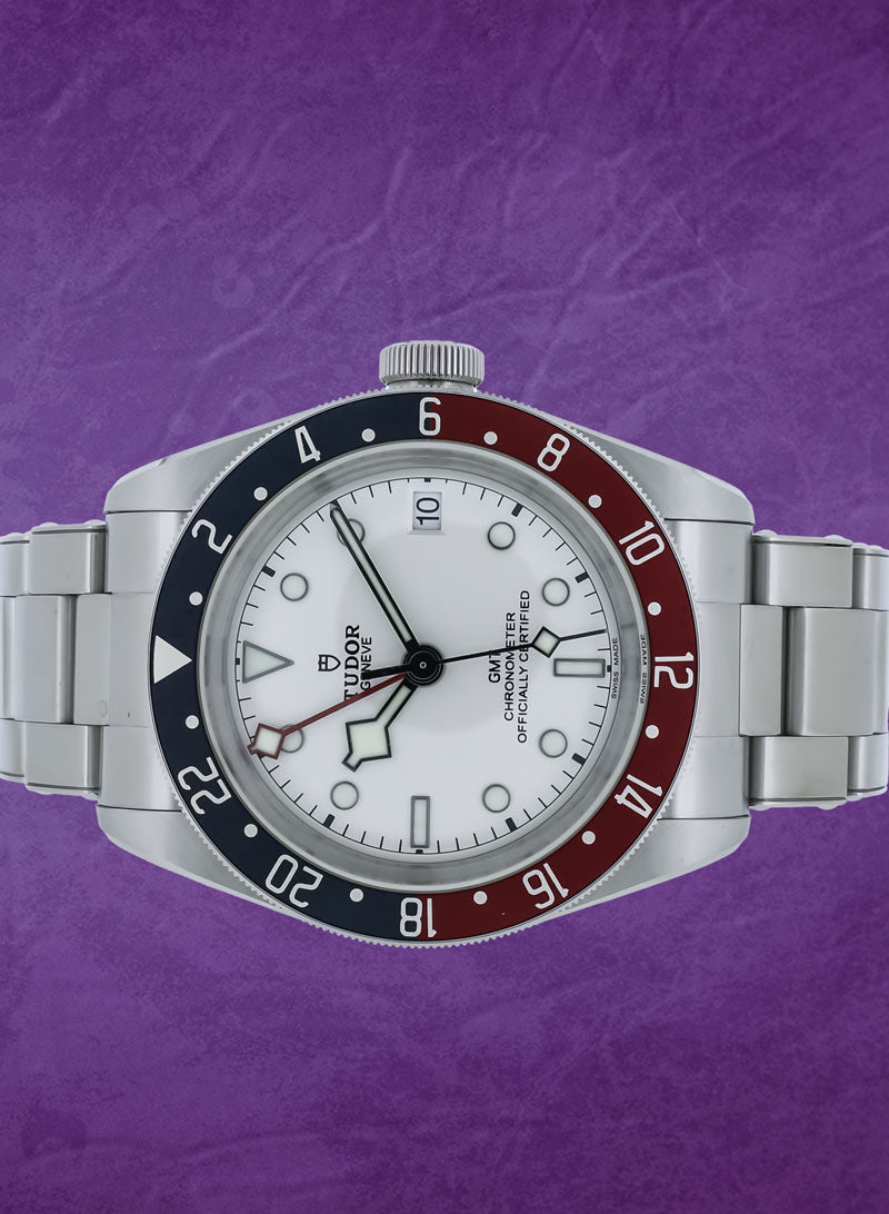 Royal Jewelers offers this preowned Tudor Black Bay GMT reference M79830RB-0010 in near-mint condition. This Tudor (M79830RB-0010) was originally purchased in 2023 and remains covered by the Tudor 5-year warranty. The stainless steel case is 41mm in diameter and has a rotating red and blue 24-hour bezel. This Tudor watch features an opaline silver dial with luminous index markers and hands indicating hours, minutes, sweep seconds, 24-hour hand, date window, and a self-winding Tudor movement. The watch comes on a stainless steel bracelet with folding clasp. This Royal Jewelers preowned Tudor (Model: M79830RB-0010) comes complete with boxes and papers.