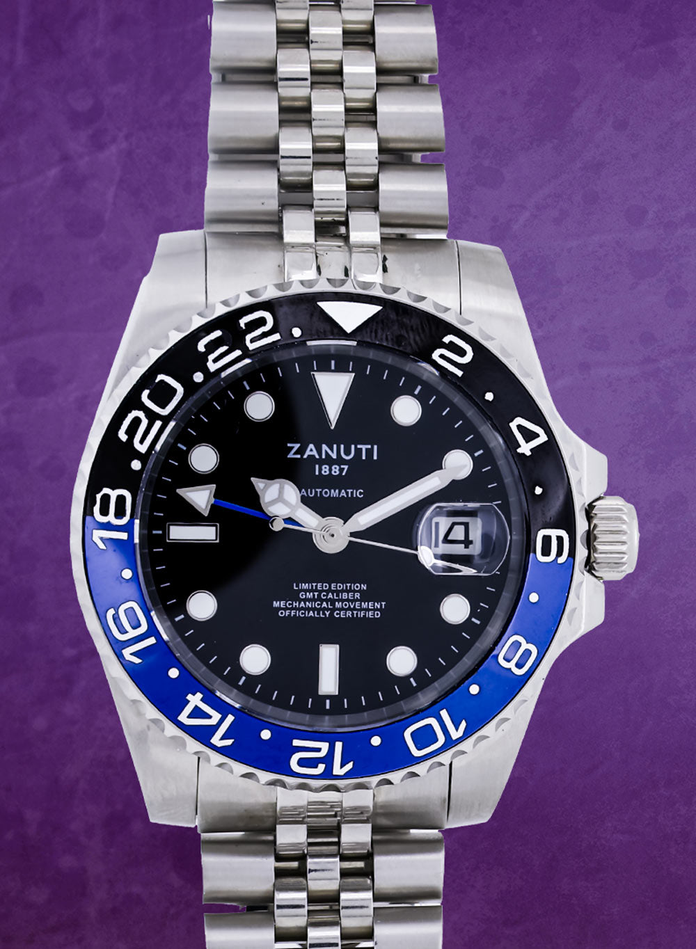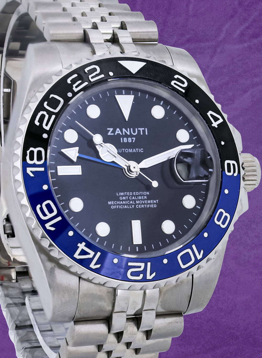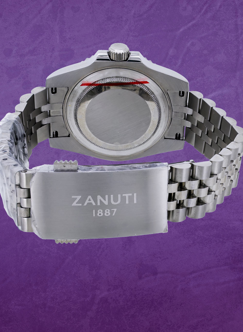 Royal Jewelers offers this certified preowned Zanuti GMT Series in excellent condition. The stainless steel case is 40 mm in diameter and has a unidirectional rotating 24 hour bezel. Black dial with luminous markers and hands indicating hours, minutes, sweep seconds, date window, and 24 hour hand. Self-winding movement. Stainless steel bracelet with folding buckle. No box or papers.